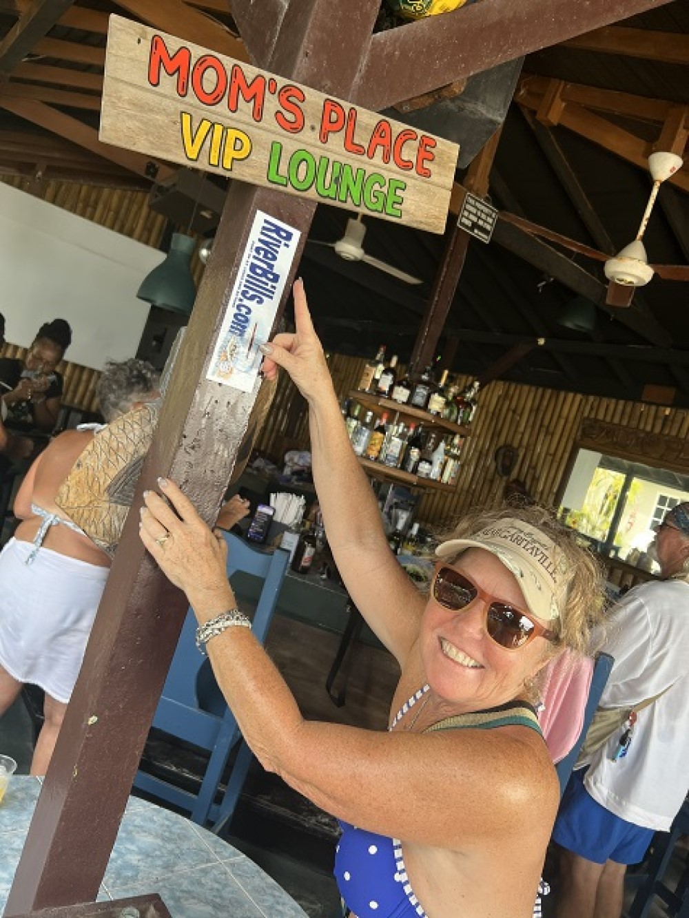 RiverBill Sticker Sighting and MaryBeth at Moms Place, Seven Mile Beach, Negril, Jamaica
