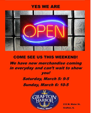 Grafton Harbor.... 618-786-PORT (7678) It is going to be a beautiful weekend to come to Grafton! Be sure to stop in Grafton Harbor Gift Shop! We look forward to seeing you! |