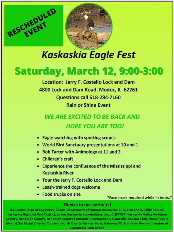 The rescheduled 2022 Eagle Fest will be held on Saturday, March 12 from 9 am to 3 pm at the Jerry F. Costello Lock & Dam in Modoc, Illinois. All of the previously scheduled vendors will be in attendance at the event.