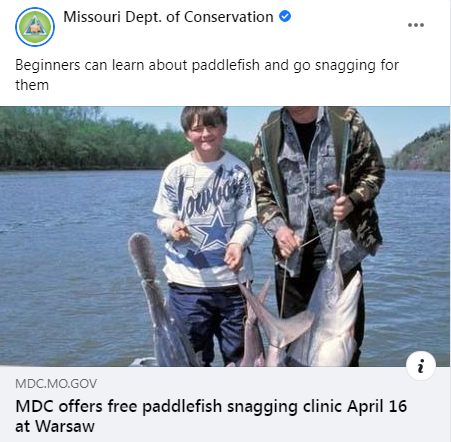 On Saturday, April 16, the Missouri Department of Conservation will be offering a free paddlefish snagging clinic in Warsaw, Missouri. There will be two sessions offered, however, space will be limited.