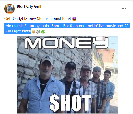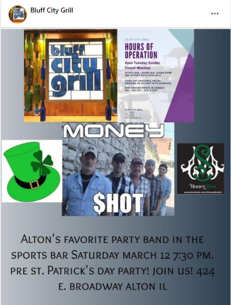 Saturday, march 12, 2022 Bluff City Grill Money $hot in the Sports Bar