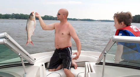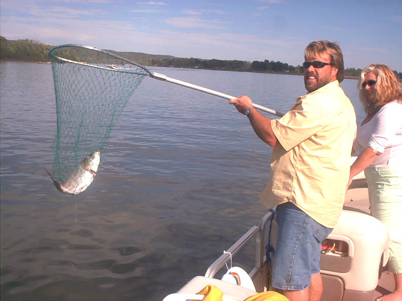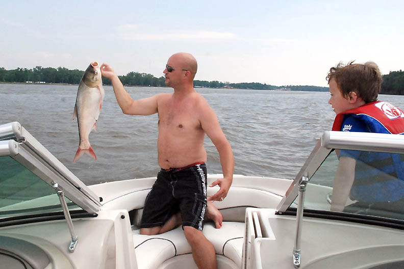 As it goes...Gary Bowers, his wife Linda and their friends, Tim and Deborah Holland, were taking a boat ride on Sunday afternoon up the Illinois River. Just below the Pere Marquette Lodge they decided to try and stir-up some of the flying carp that have invaded our area. Seems as if Gary knows a spot around there where those carp like to hang out. While motoring around on the west side of the river they stirred up some of the carp and they started jumping out of the water, mostly behind the boat. It was sort of neat to watch but Tim is an adventurous type guy and decided to do a little fishing...with a fish net... Yes ...A Fish Net ! He positioned himself near the back of the boat ....And wouldn't you know it, before long Tim landed one...Right out of the air......Or... It might have jumped into the fish net that he was holding ! Either way, this sure gives a whole new meaning to the phrase "Fly Fishing."