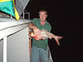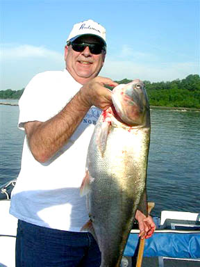 My buddies and I fish the river every Thursday after work. We are all Boeing employees or retirees. Last Thursday, June 15, we were pulling into a fishing spot near a wing dam below Kinder's when this fish jumped into our boat creating quite a ruckus. . We fish out of a deep-vee Starcraft boat so it took some muscle for the fish to propel itself that far out of the water. Dave Clapper is the guy holding the fish. Ray Shank and Emmett Conroy are the other two who were with us that night.