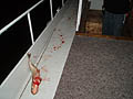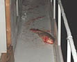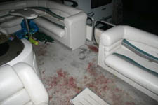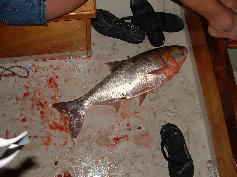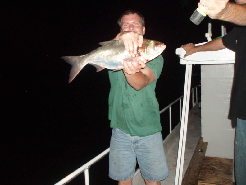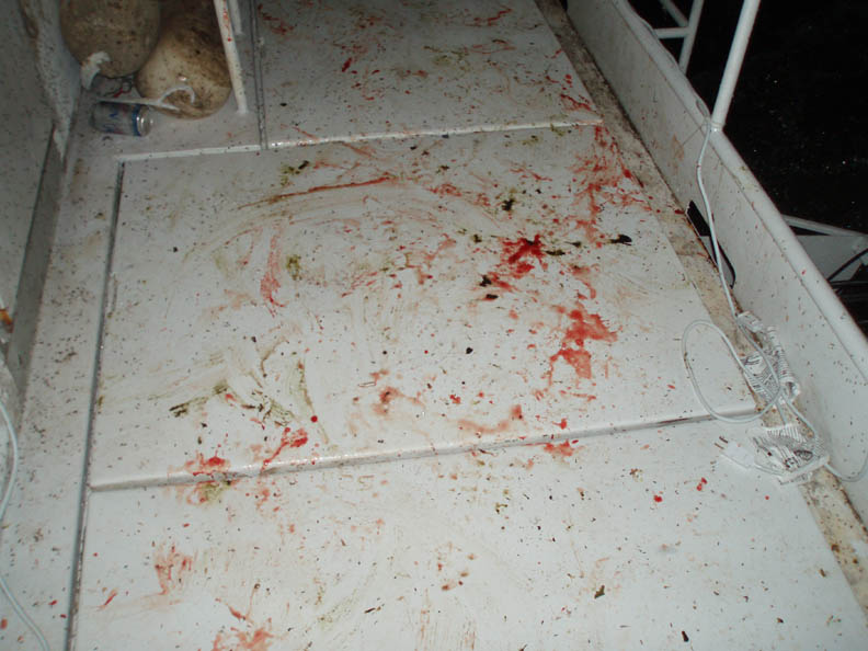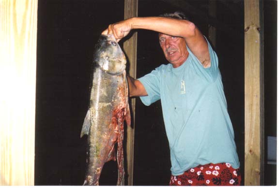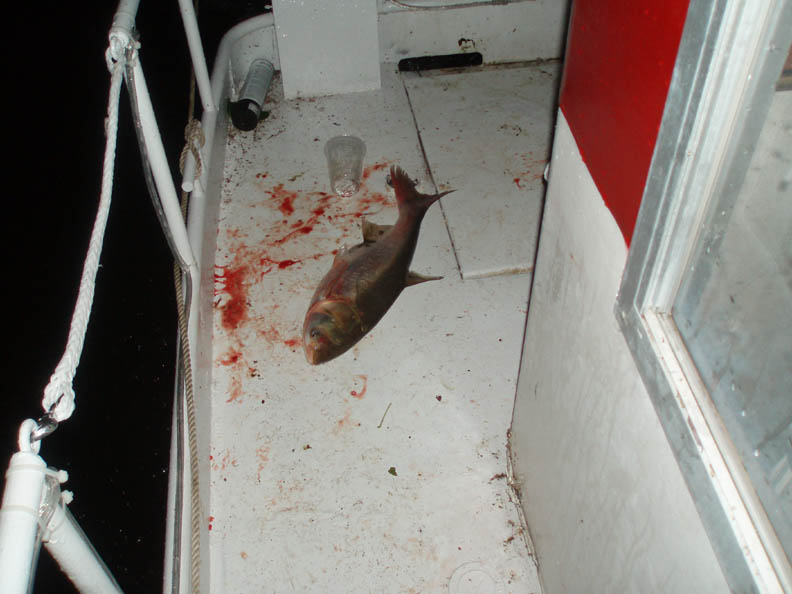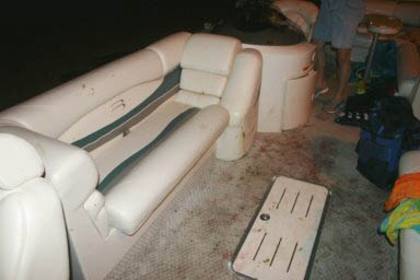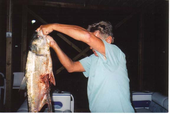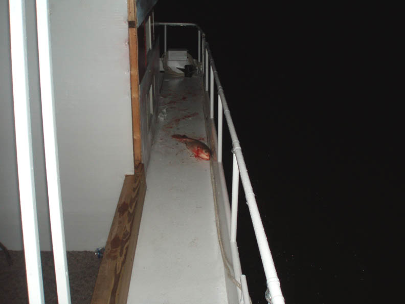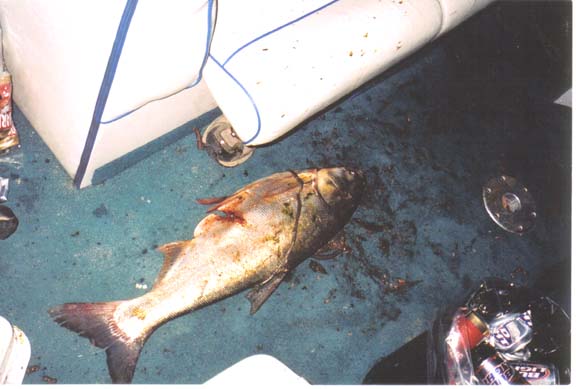 The 1st set of pictures are of a Flying Asian Carp that jumped into Larry Mahrs' pontoon boat after one of the Thursday night parties at Iowa Island on 9-09-04 while going through the "cut through". Bob Hampel is shown holding the "September 9th Catch". The 2nd set of pictures are of another Asian Carp that jumped into the same boat one week later ! WHAT ARE THE CHANCES ??....... The second one jumped aboard on 9-16-04 while in front of Woodland Marina. John Patrico said that it landed on the front of the pontoon boat, flopped around until it hit and opened the gate to the inside of the boat. What a mess it made ! Photo's by Johnny Patrico. |