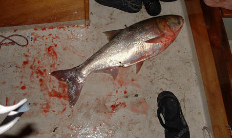 RiverBill says........A person cannot put into words the level of excitement that is created when one of these fish jumps into your boat. Sometimes they are jumping out of the water all around you, sometimes not...It's sort of neat, sort of scary...And definitely a slimy and bloody experience. Good Catch Robert.....Glad you weren't hurt.