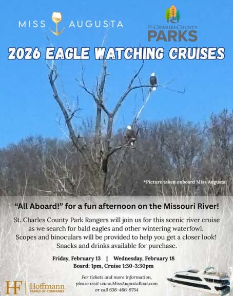 Join Miss Augusta Cruises for their 2026 Eagle Watching Cruises, where St. Charles County Park Rangers help spot bald eagles and other wintering waterfowl.