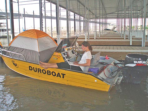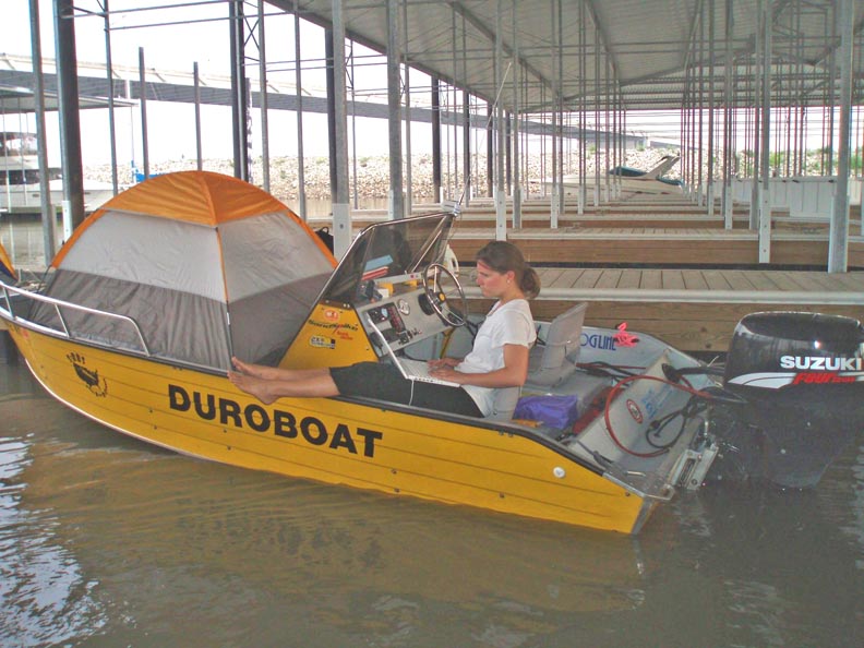Ashley Dechant Traveling from St. Paul, Minnesota to New Orleans in a 12 foot fishing boat at Hoppies Marina Mississippi River at Kimswick, Mo UMR 158