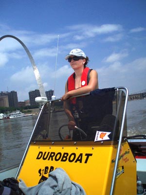 Ashley Dechant Traveling from St. Paul, Minnesota to New Orleans in a 12 foot fishing boat at Woodland Marina Mississippi River at St. Charles Mo UMR 222.2 Ashley arriving at Woodland Marina