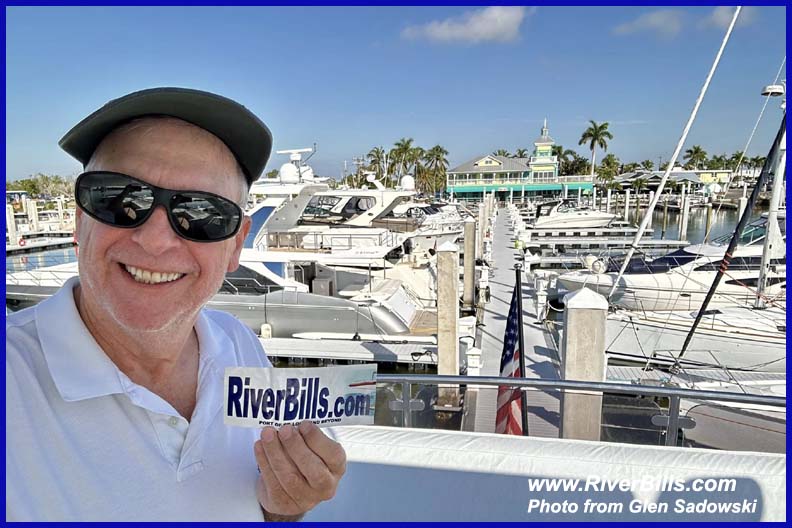It’s hard to see but there is a RiverBills sticker on the power pedestal behind my boat, Andiamo. Judy and I are cruising the Bahamas this winter.